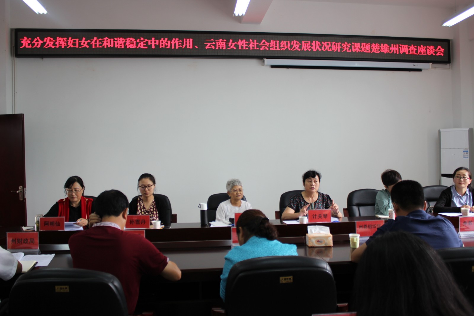 2018年6月26日至28日,省妇联副主席计关琴带队,云南省社科院社会学所研究员赵捷及省社科院助理研究员欧晓鸥等一行11人,到楚雄州、永仁县及武定县就“充分发挥妇女在社会和谐稳定中的作用”、“云南女性在社会组织发展状况”两个课题开展调查研究。该课题是省妇联、省妇女儿童发展中心承接云南省委政策研究室的云南省省级党群系统决策科学研究课题。